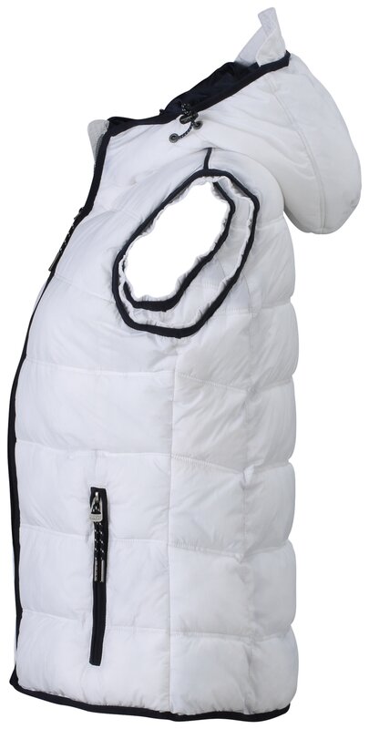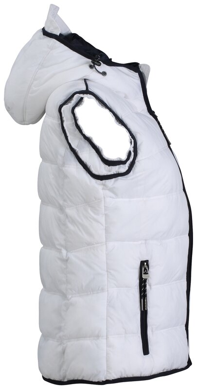 Módní dámská vesta s kapucí v designu pro jachting, ale i do práce i pro volný čas. Matný povrch s vrstvou odpuzující vodu, vodě a větru odolná (600 mm vodní sloupec), 2 kapsy na zip, náprsní kapsa, zapínání až ke krku. Bunda má zipy a doplňky v kontrastní barvě a elastické průramky. Balení: 1/20 (ks v jednom sáčku / celkem ks v kartonu).