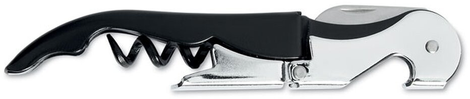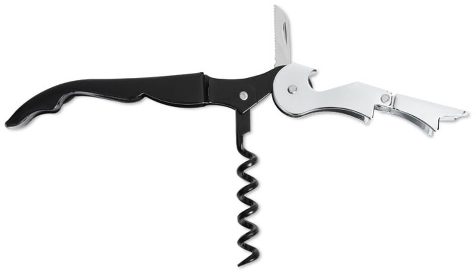 Originální vývrtka na víno z oceli s dvojitým korkovým podstavcem.