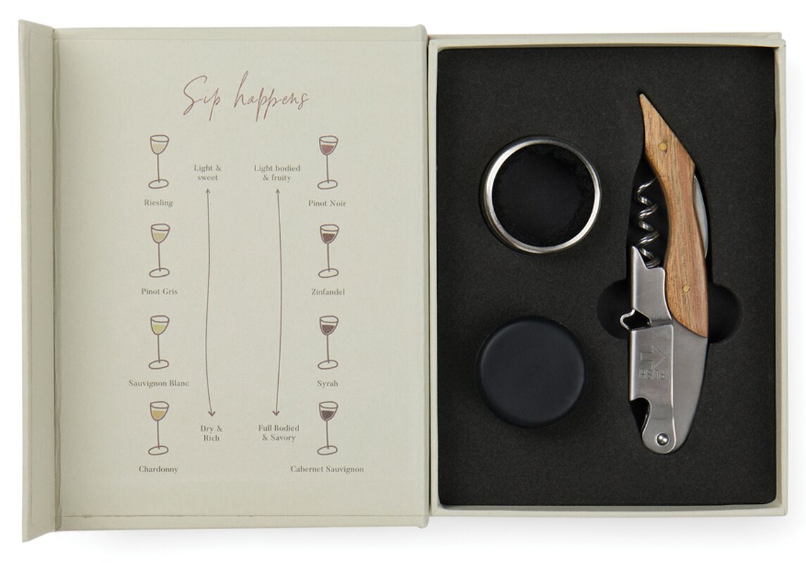 Celá sada je uložena v dárkové krabičce z FSC® kraftového papíru, která je nejen ekologická, ale i vizuálně působivá. Skvělý tip na prémiový dárek pro klienty, partnery nebo milovníky vína, kde i samotné balení vypráví svůj příběh.