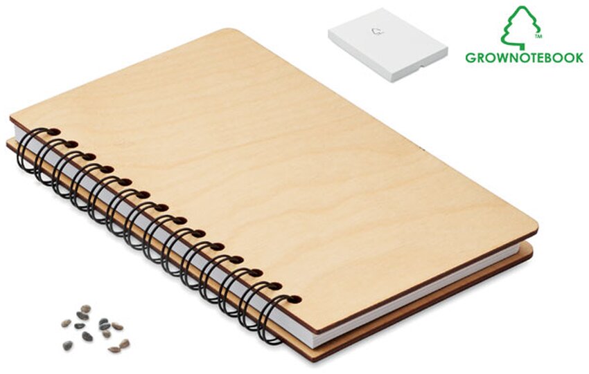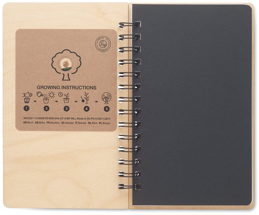 Zápisník GROWBOOK™ formátu A5 v dárkovém balení má pevné desky a 144 linkovaných stránek (72 listů). Kroužková vazba. Obsahuje semena břízy. Vyrobeno v EU.