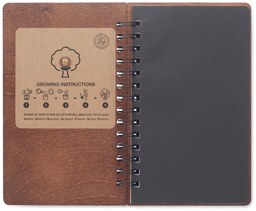 Zápisník GROWBOOK™ formátu A5 v dárkovém balení má pevné desky a 144 linkovaných stránek (72 listů). Kroužková vazba. Obsahuje semena břízy. Vyrobeno v EU.