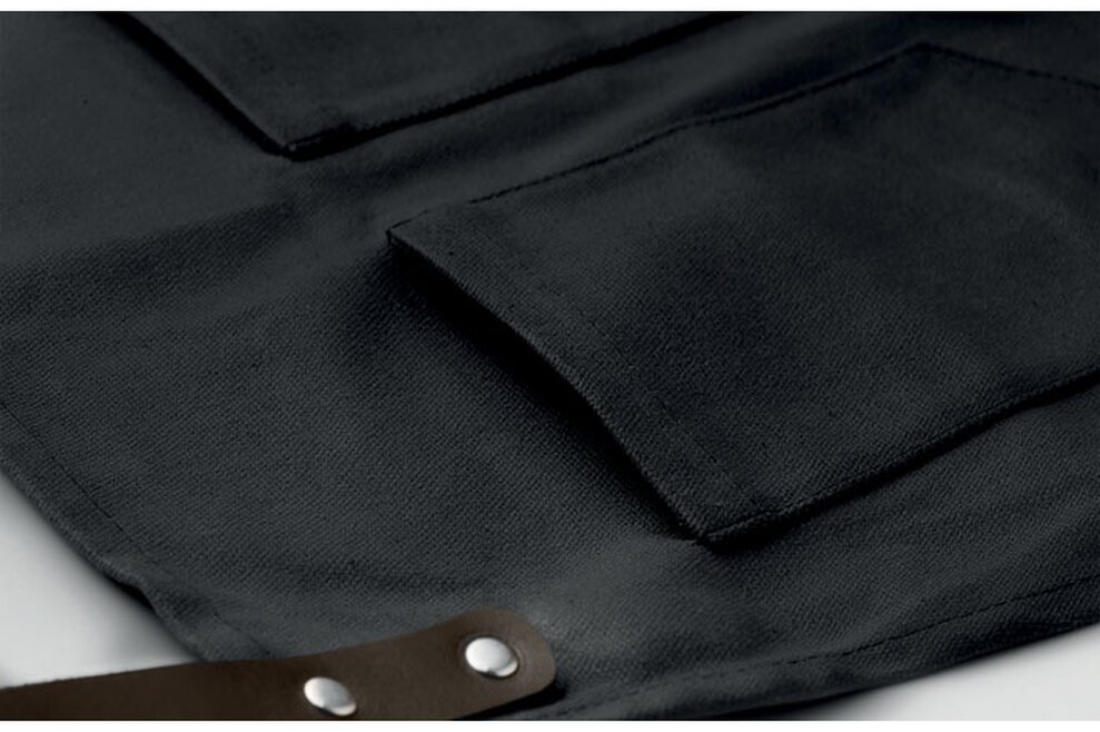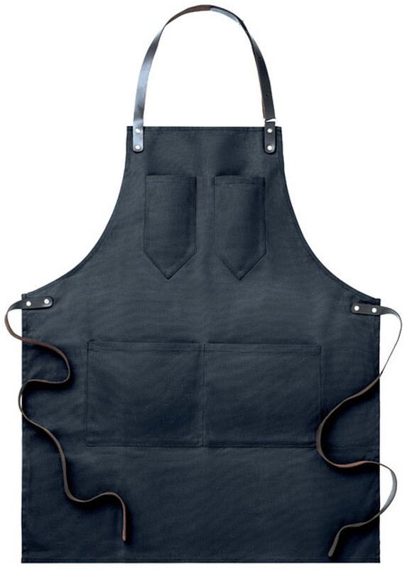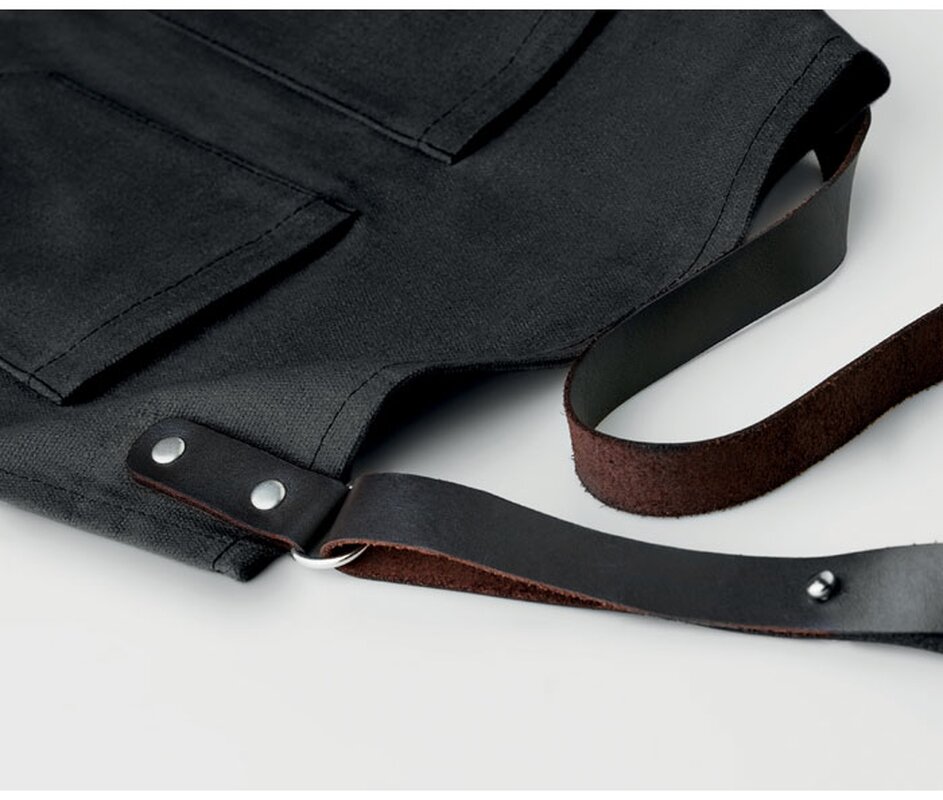 Moderní "hipster" grilovací zástěra s koženými detaily a povoskovaným povrchem má nastavitelný popruh, dvě kapsy na hrudníku a velkou spodní kapsu. Udělá radost kuchařům, které baví jejich práce. Vyniknou na zaměstnancích cateringových firem, nebo udělají radost moderním mužům, jako firemní poděkování.