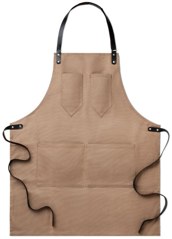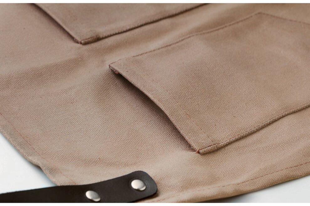 Moderní "hipster" grilovací zástěra s koženými detaily a povoskovaným povrchem má nastavitelný popruh, dvě kapsy na hrudníku a velkou spodní kapsu. Udělá radost kuchařům, které baví jejich práce. Vyniknou na zaměstnancích cateringových firem, nebo udělají radost moderním mužům, jako firemní poděkování.